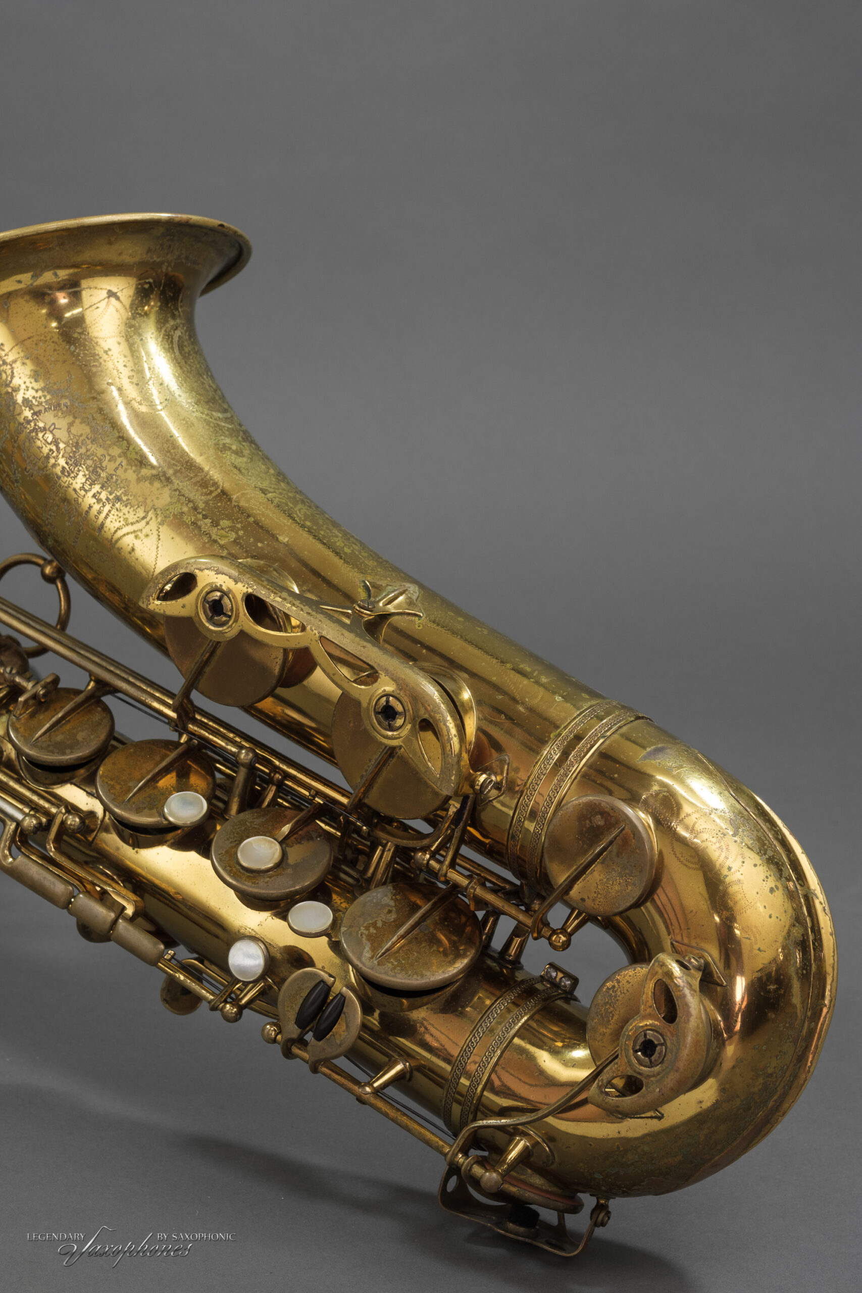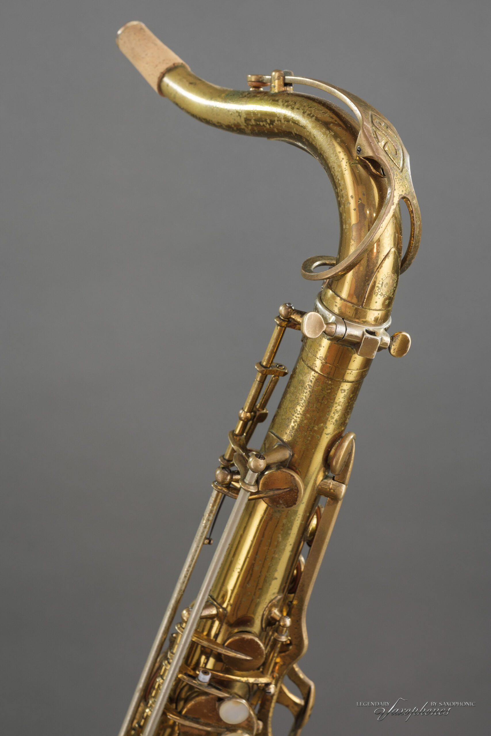 Production of this SELMER Mark VI tenor saxophone began in the fall of 1954 and was shipped to the sister factory SELMER London in the first 3 months of 1955, where it was lacquered and fully assembled.
