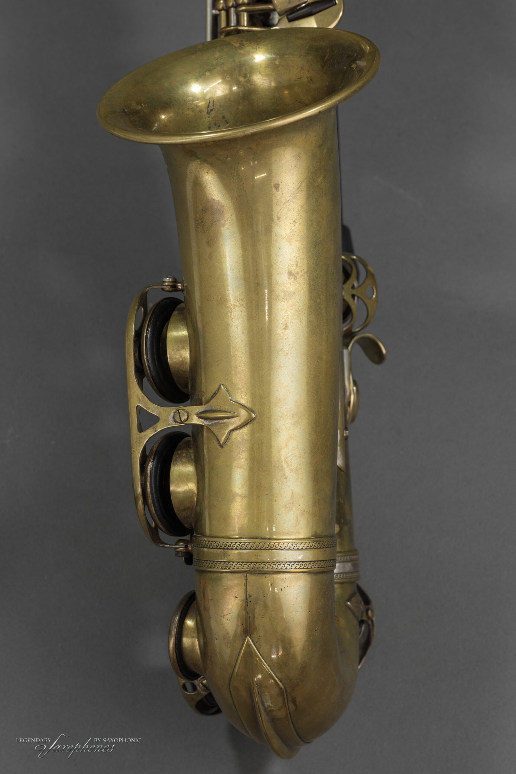Das SBA Alto wurde vor einiger Zeit generalüberholt und gerade in unserer SAXOPHONIC-Werkstatt feinjustiert. Es ist in einem technisch sehr guten Zustand und lässt sich wunderbar leicht spielen! Der Daumenhaken wurde vermutlich bei der Generalüberholung durch einen modernen, verstellbaren Daumenhaken ersetzt, ebenso die Daumenauflage des linken Daumens. Das Spielgefühl dieses SBA Altos kommt nun dem eines Mark VI sehr nahe.